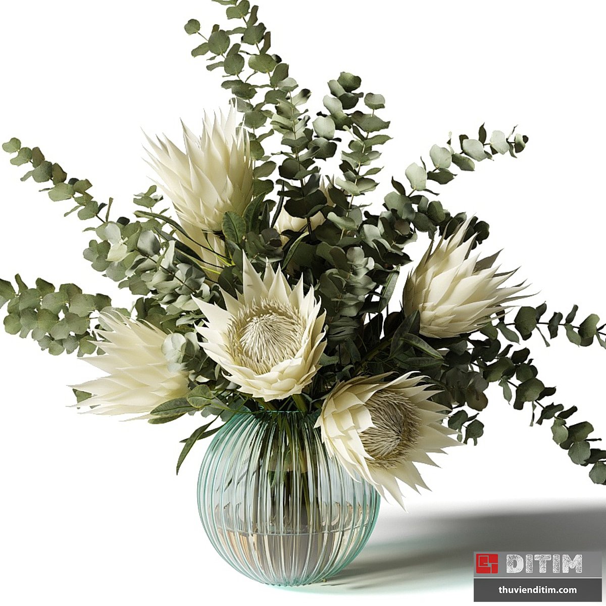 | • Tên model: | Bouquet with white proteas and eucalyptus in a ribbed glass vase |